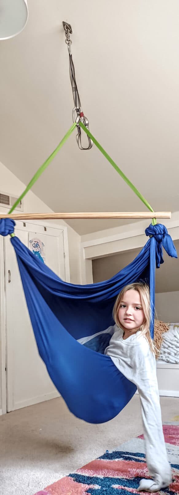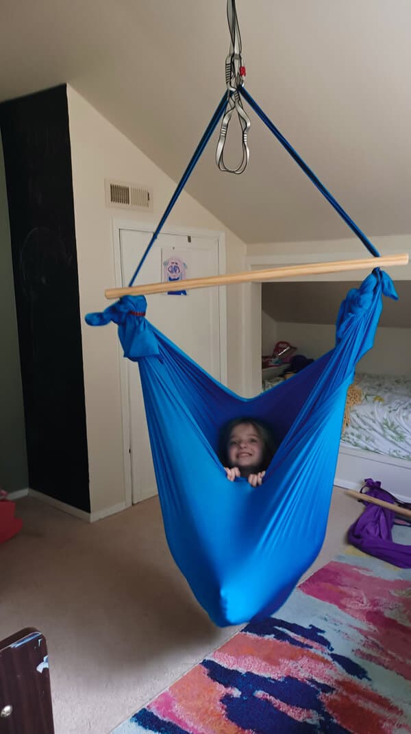 Our indoor therapy swing for kids is pre-assembled for quick and easy set-up; designed to let your child get started with playtime as soon as the new indoor swing arrives! Along with the Wombat Pouch Sensory Swing©, each package includes 2x carabiners, 1x daisy chain, 2x double O-slings and 1x spreader bar. Ceiling hardware available if needed.