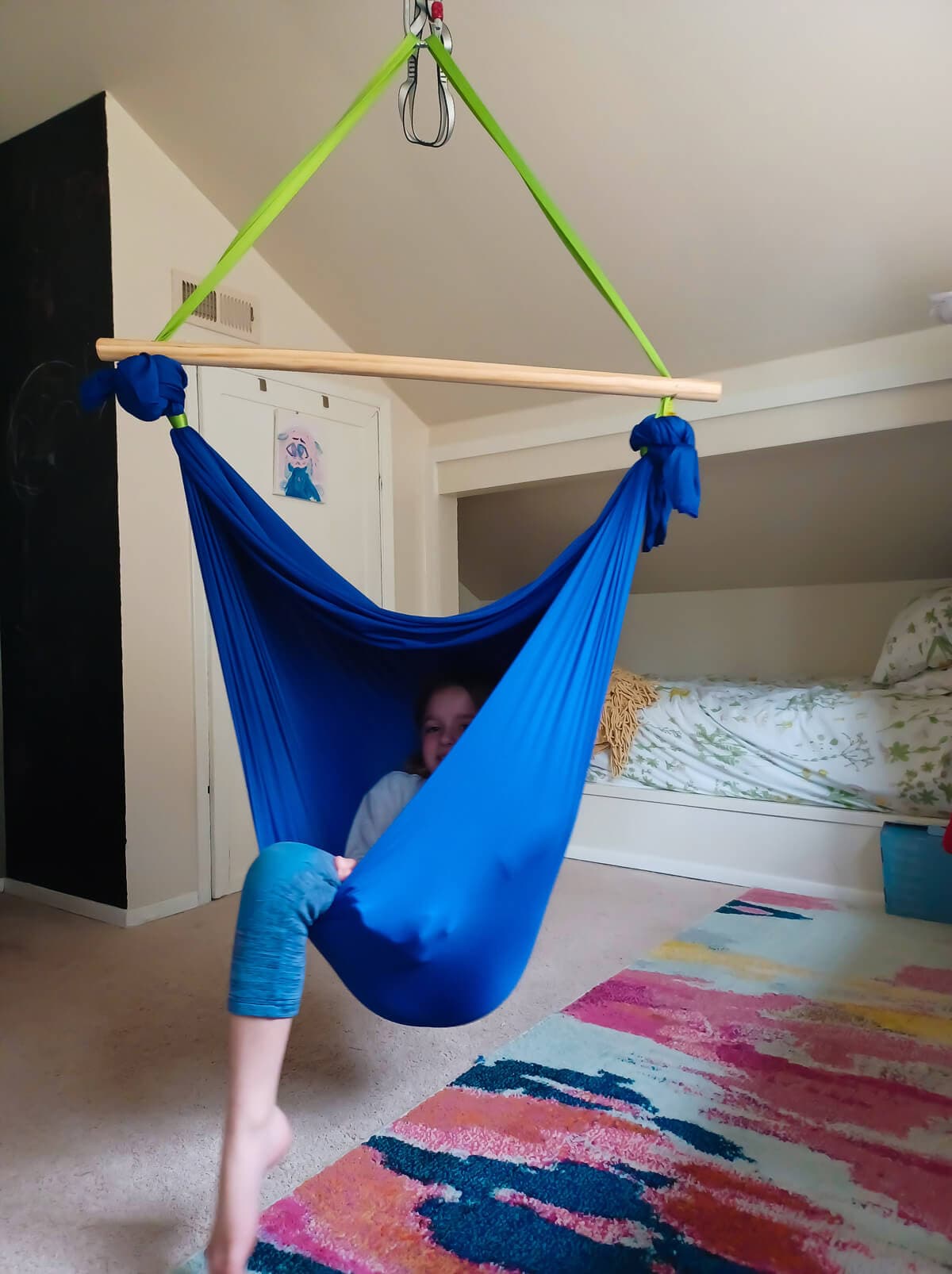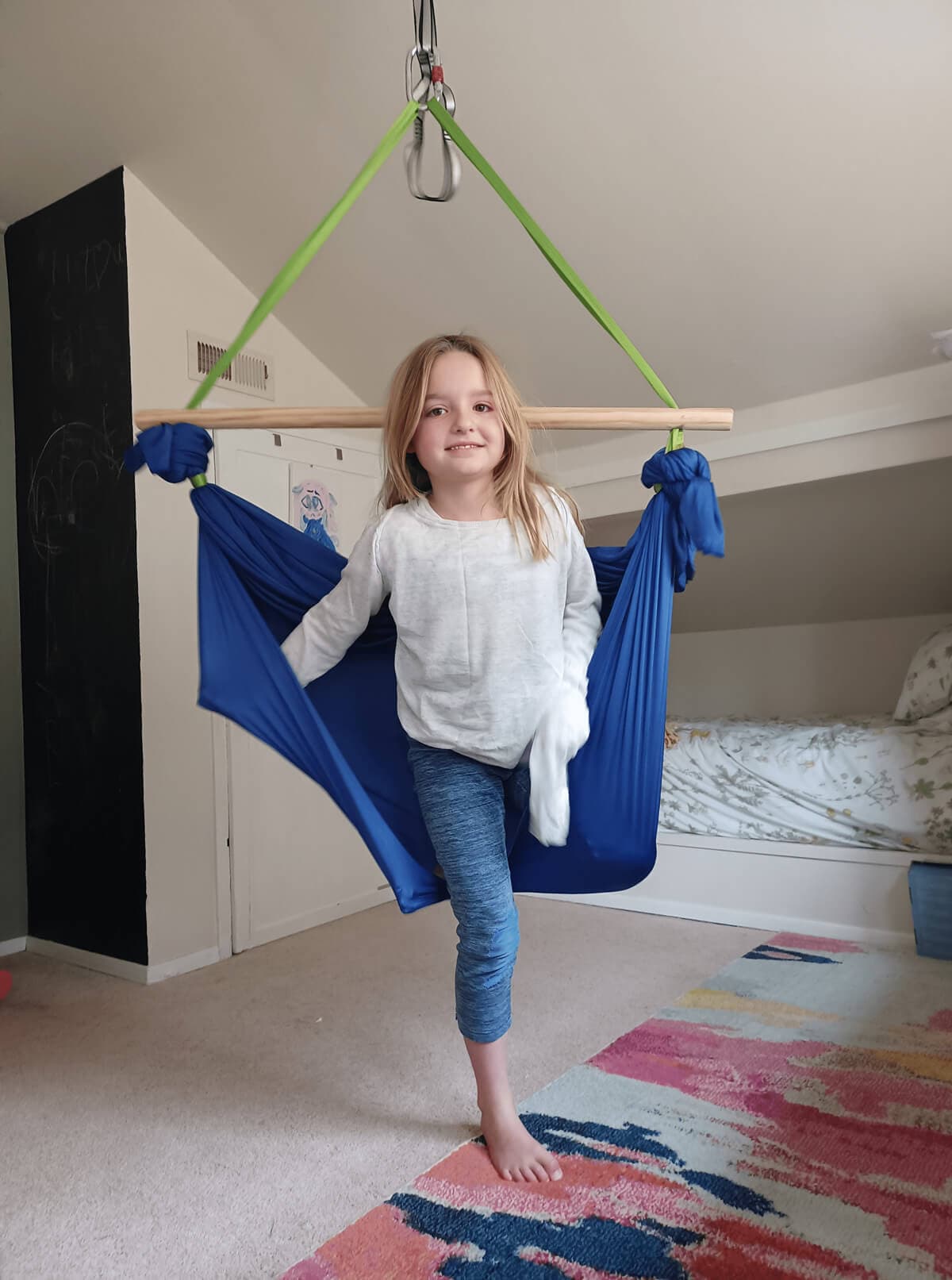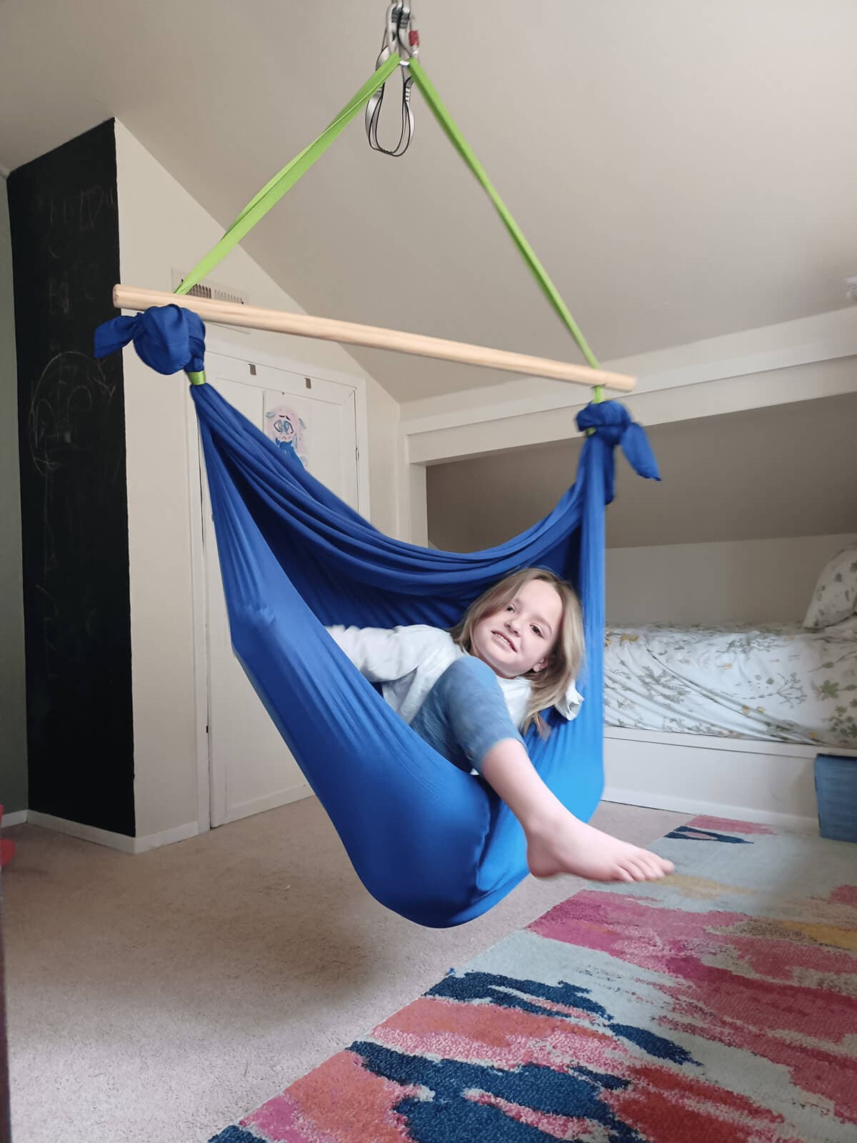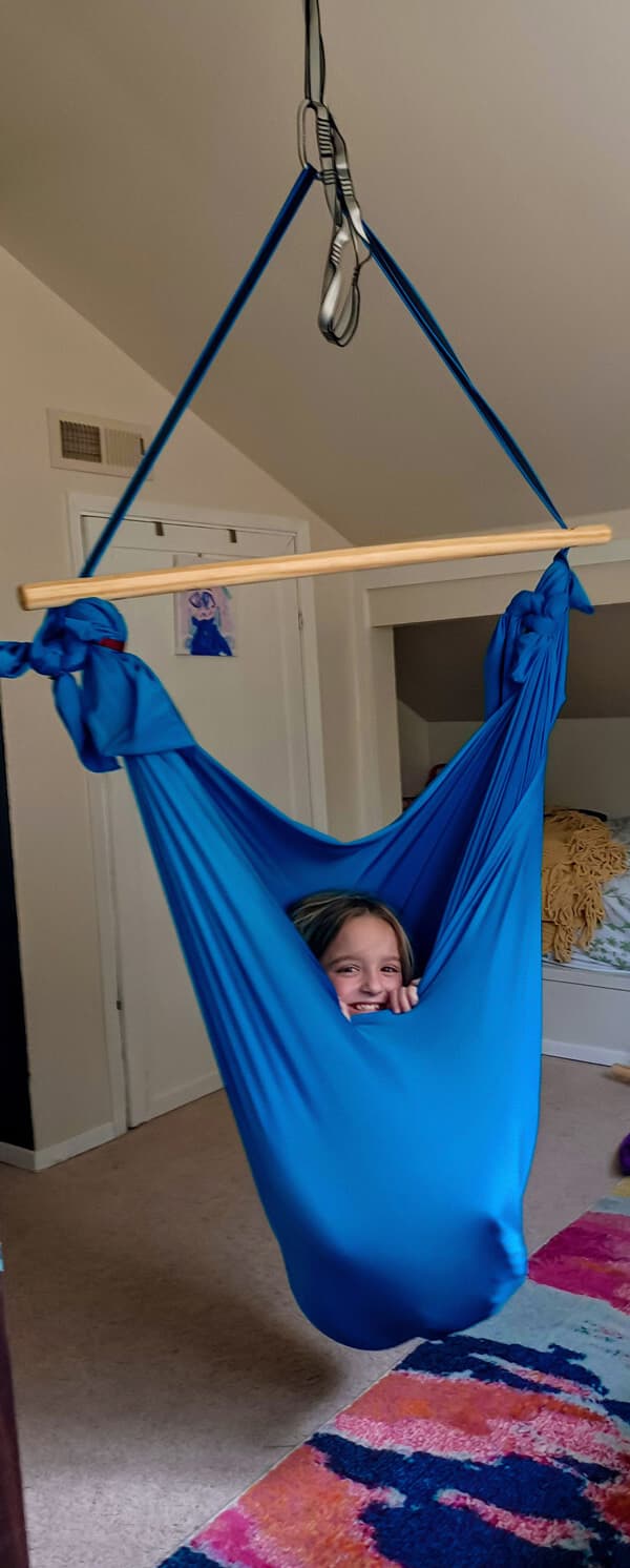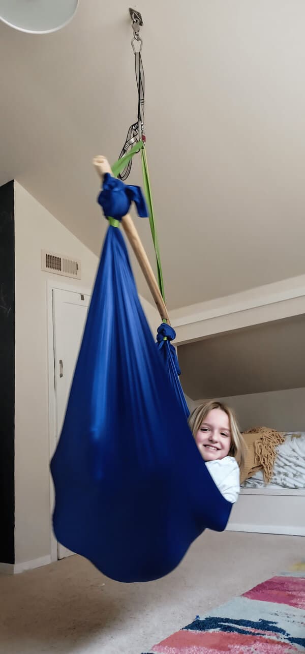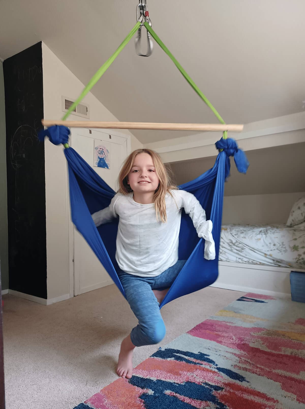 Our Wombat Pouch Sensory Swing© will be your child’s new favorite place to play and calm down! This indoor kids’ swing is specifically designed for fun and sensory input.