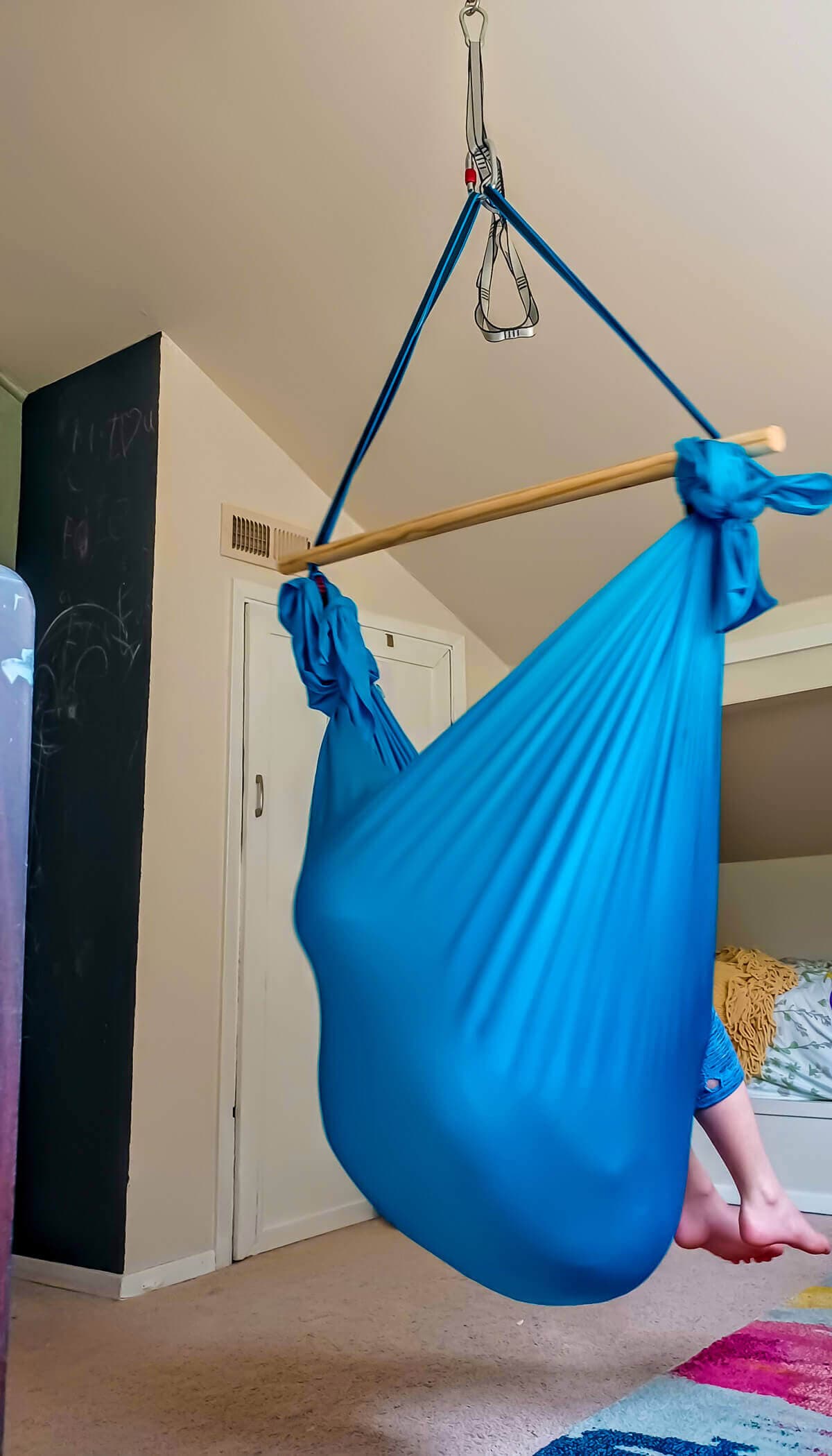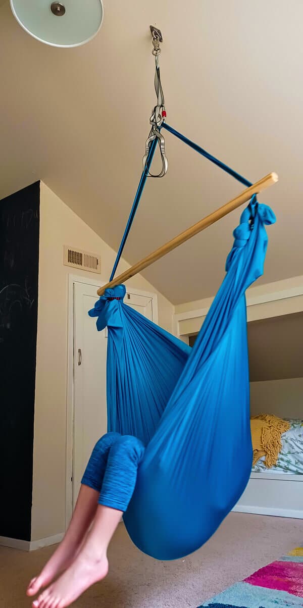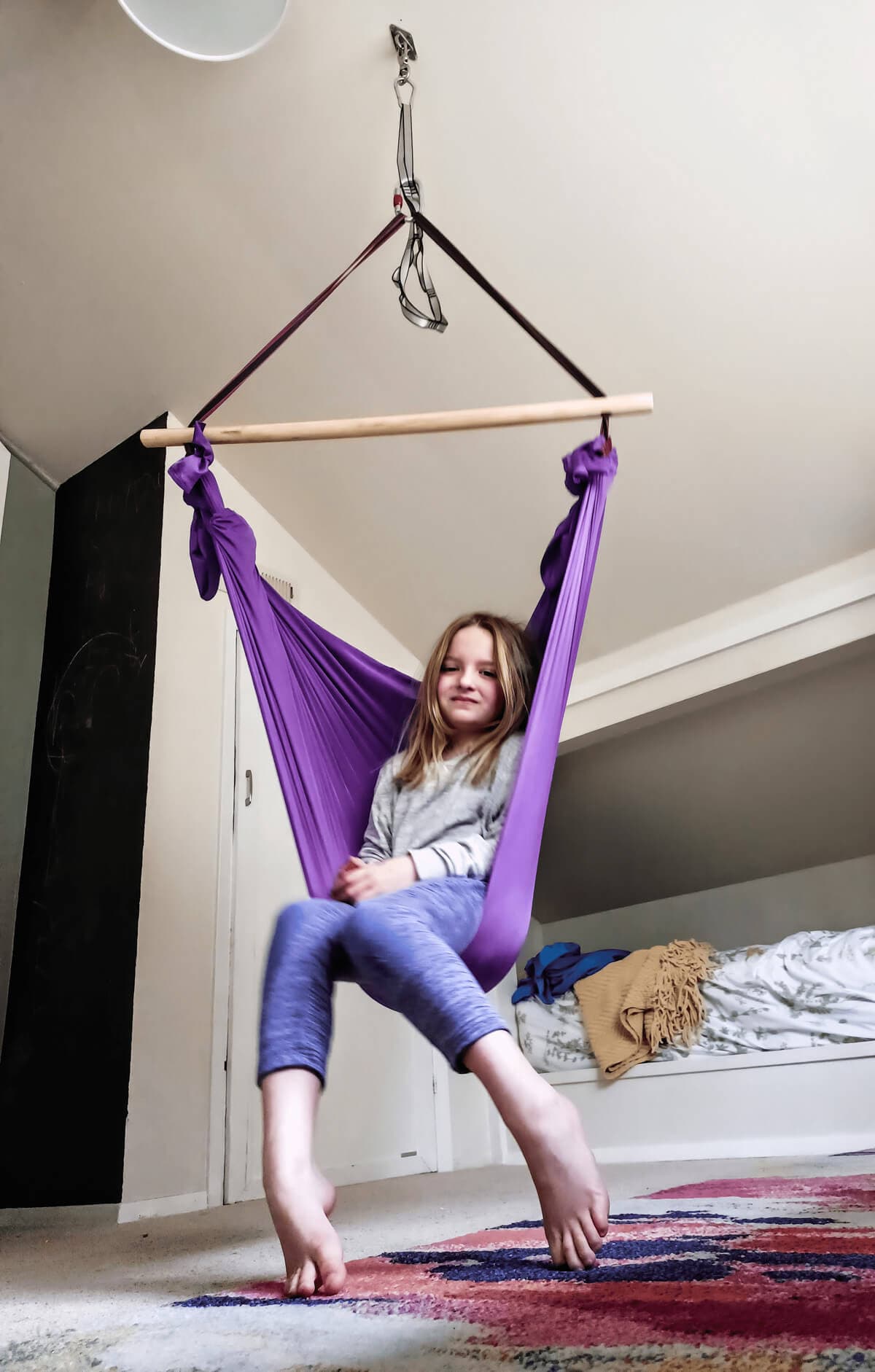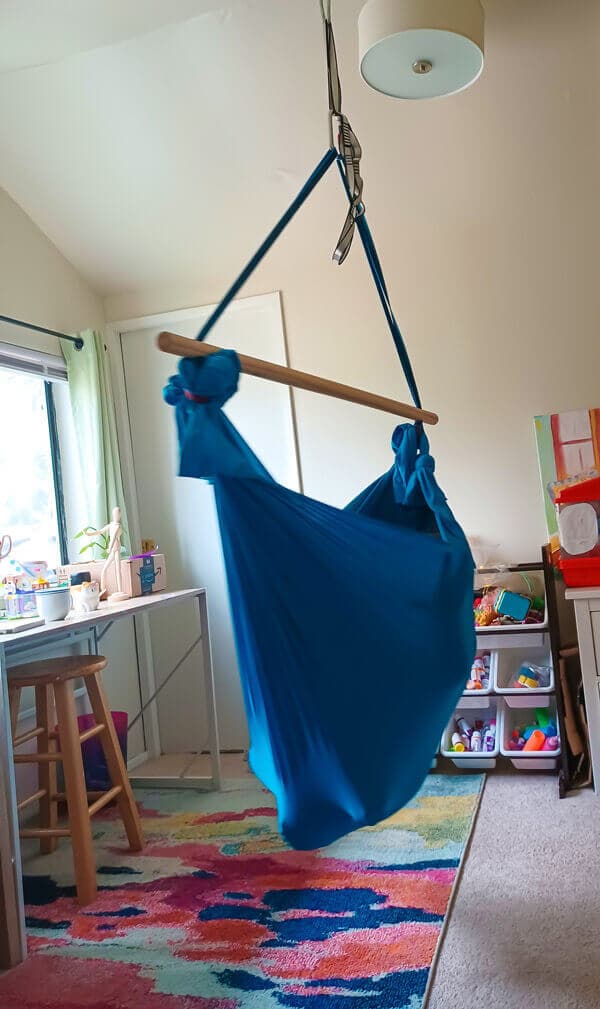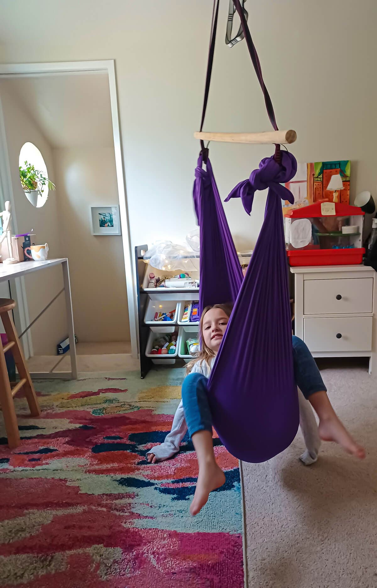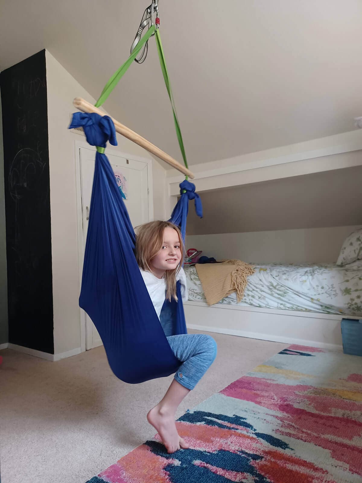 Our Wombat Pouch Sensory Swing© will be your child’s new favorite place to play and calm down! This indoor kids’ swing is specifically designed for fun and sensory input.