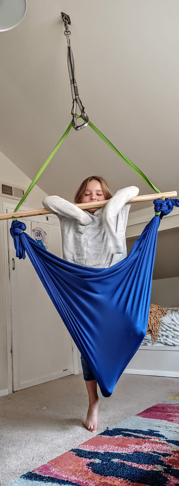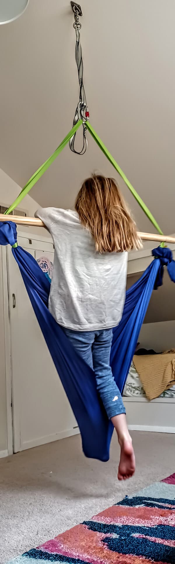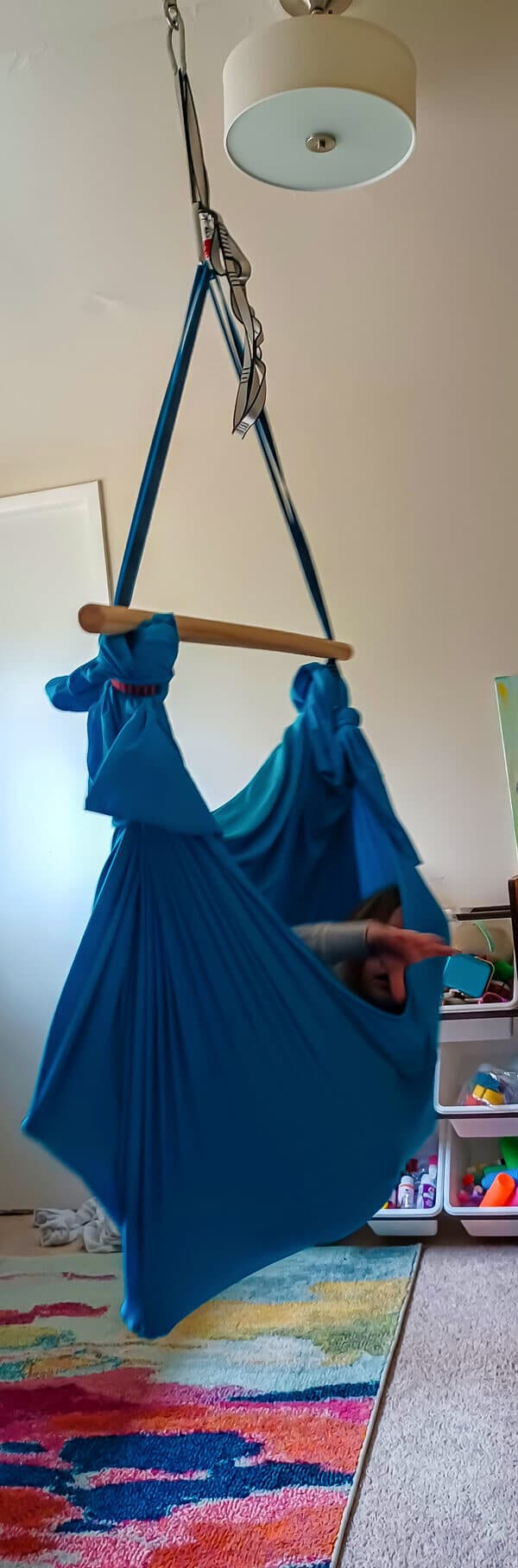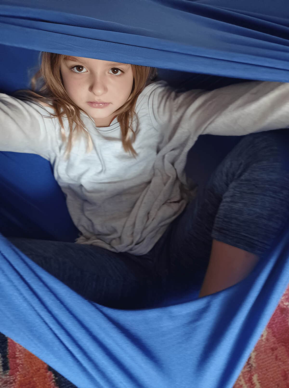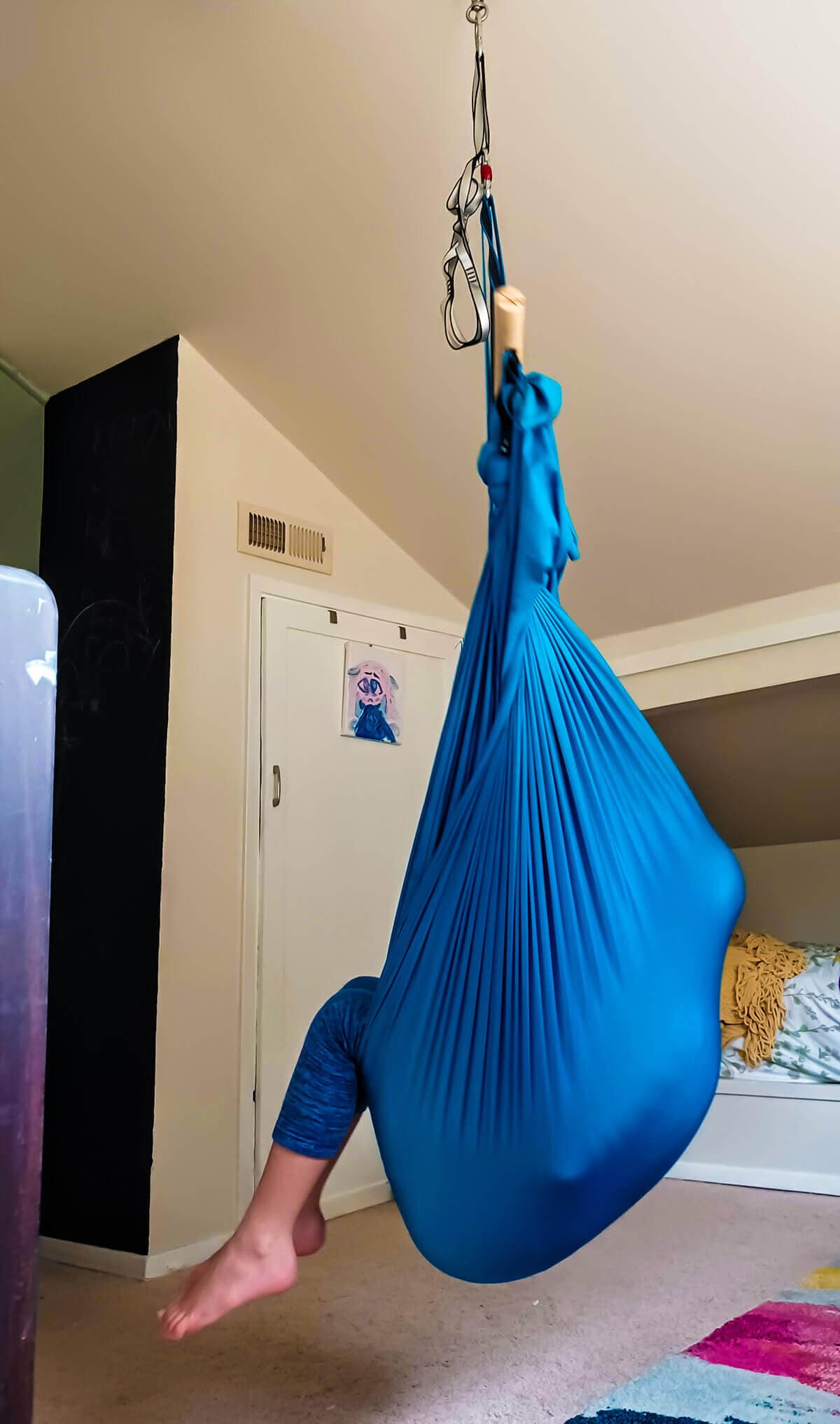 Our Wombat Pouch Sensory Swing© will be your child’s new favorite place to play and calm down! This indoor kids’ swing is specifically designed for fun and sensory input.