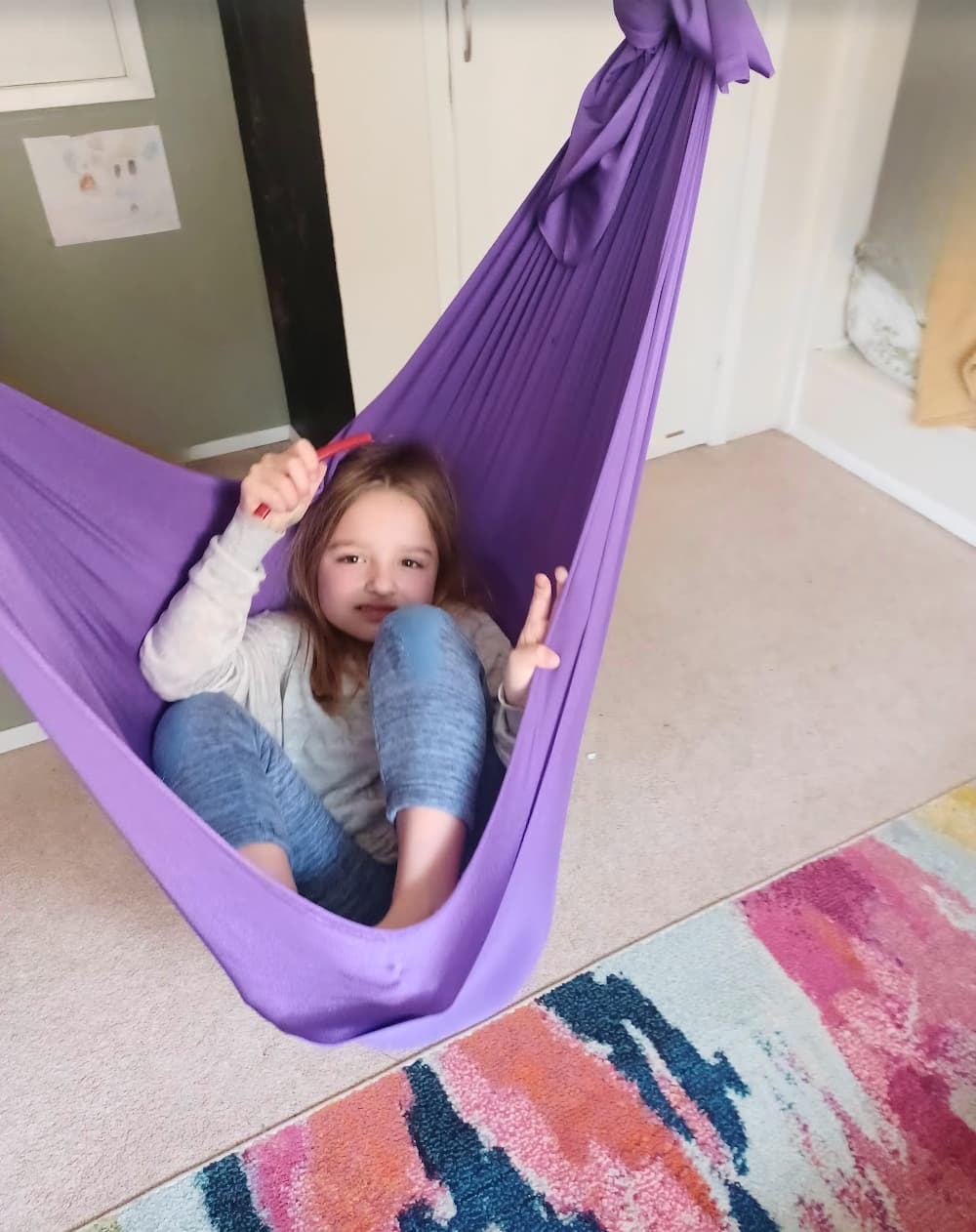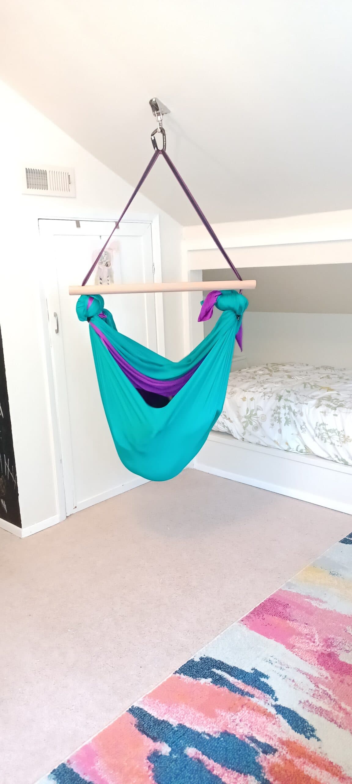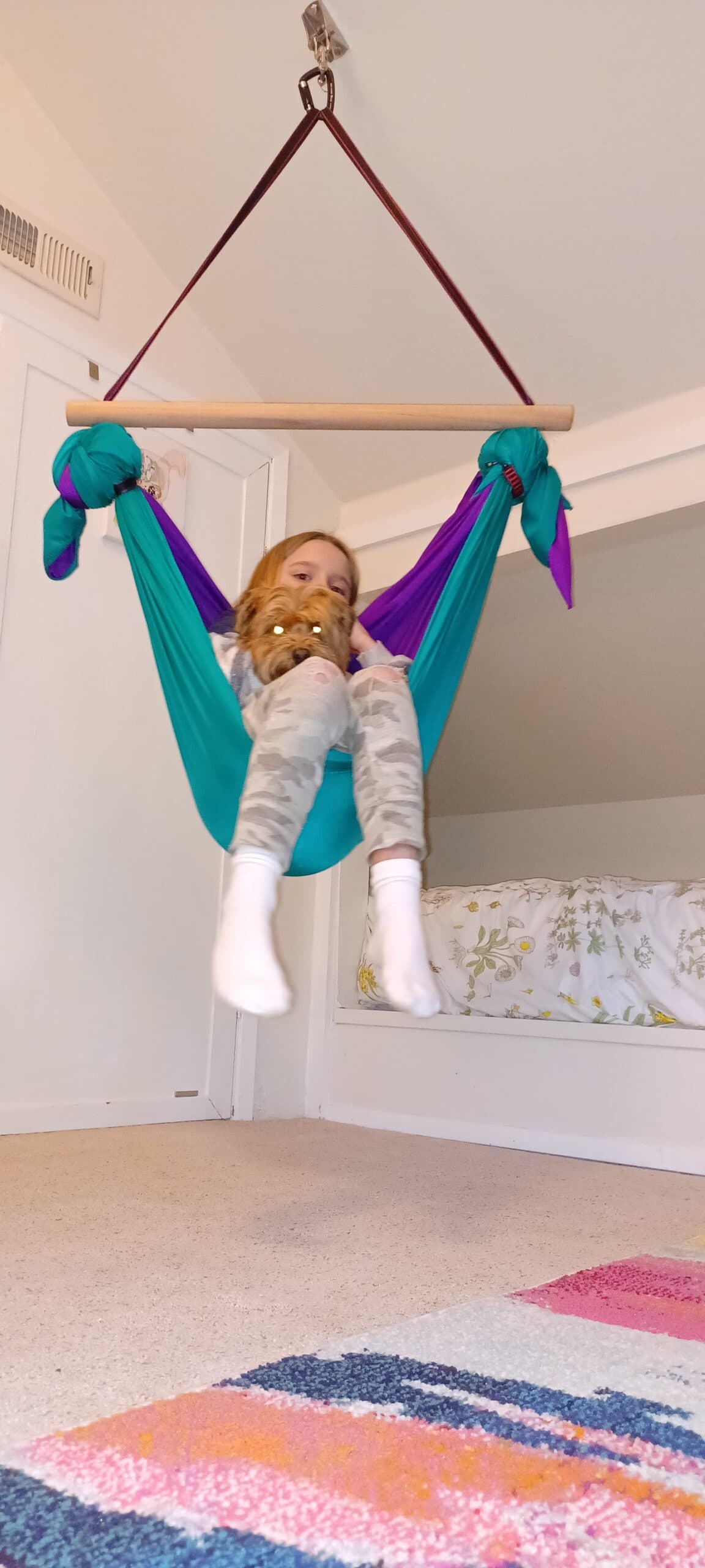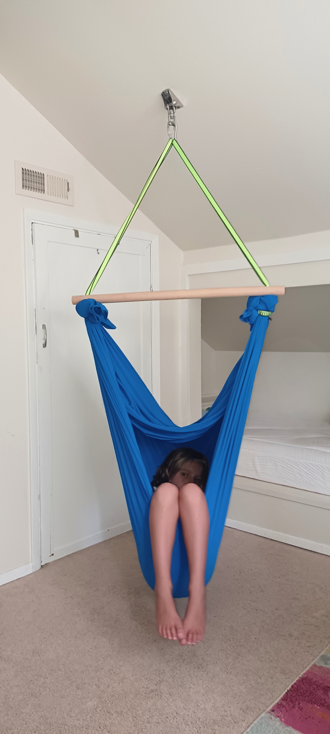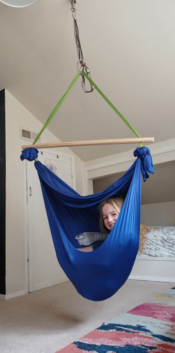 The swing installs easily as an indoor sensory swing with ceiling mount and works well in shared spaces, bedrooms, or apartment-friendly sensory swing setups. Its durability and structure make it suitable for teens and adults looking for therapeutic swings for neurodivergent adults, as well as children who need reliable sensory input throughout the day.